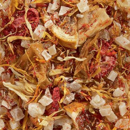 Candied pineapple and mango cubes, pineapple and mango flakes, orange and strawberry slices, mandarin orange pieces, and marigold flowers.